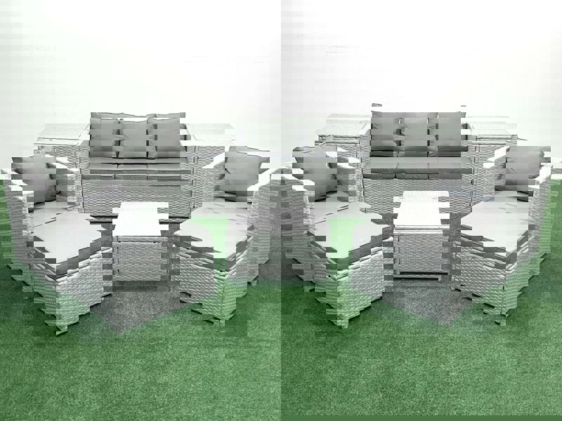 Designed for relaxed outdoor living, this 7 seater rattan garden furniture set brings a coordinated look to patios and gardens. Crafted from PE rattan with a galvanised steel structure, it is made for strength and year-round outdoor use, while the light grey mixed rattan and dark grey fabric create a considered, modern finish.
