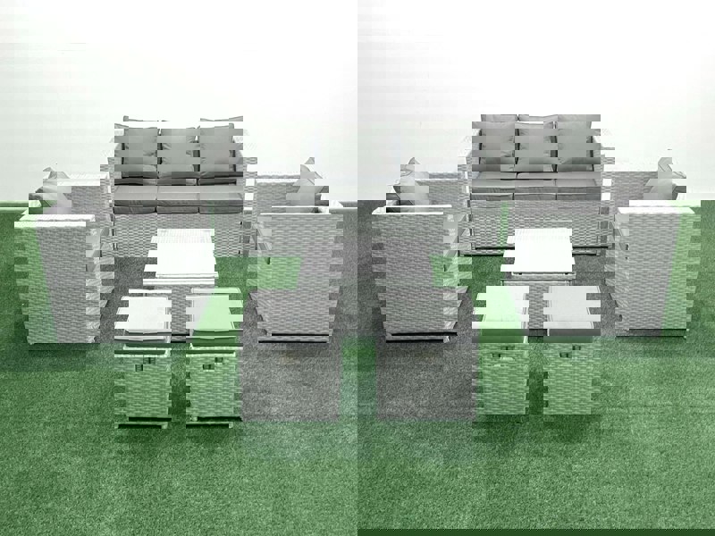 Finished in light grey mixed rattan with dark grey fabric, the set includes supportive seating with thick cushions and a square coffee table topped with clear tempered glass. Items arrive flat-packed for self-assembly, with two stools supplied fully assembled.