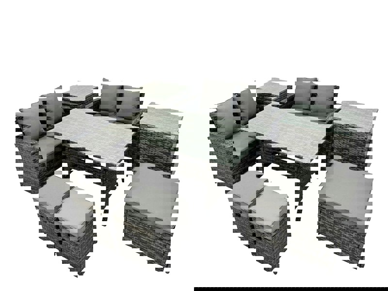 Create a refined outdoor dining and lounging space with this 7 seater rattan furniture set, designed for patios and gardens. Made from high quality PE rattan with a durable galvanised steel construction, it is built for everyday outdoor use and can be left outside all year round. Finished in dark grey mixed rattan with dark grey fabric, the set offers a coordinated look for relaxed meals and informal gatherings.