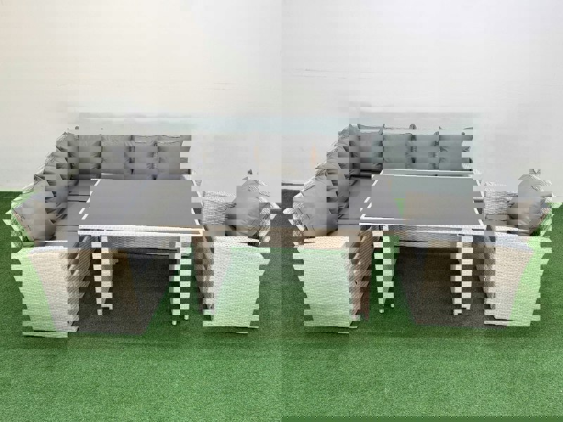 Create a refined outdoor seating and dining area with this classic 7 seater corner sofa set. Designed for relaxed gatherings at home, it pairs a comfortable, soft cushion back with an ergonomic high-back, reclining design for added comfort. The set is finished in mixed rattan with dark grey fabric, offering a considered look for patios and gardens.