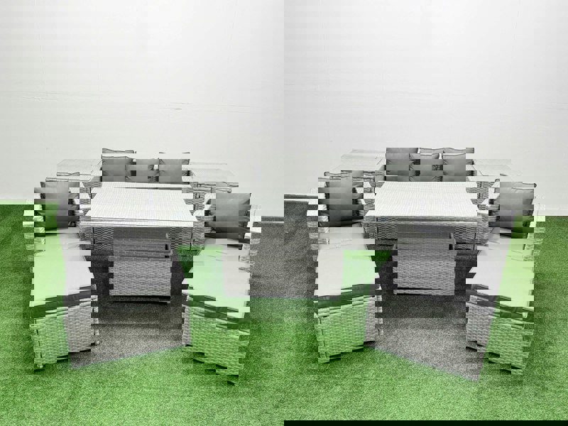 Create a refined outdoor seating and dining area with the Fimous 8 PCs Rising Dining Table Set. Designed for flexible garden living, this coordinated rattan furniture set includes a three seater sofa, chairs, foot stools and side tables, with an adjustable table that can be used for coffee or dining.