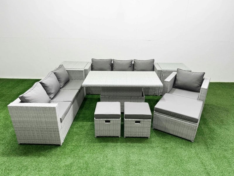 The Fimous 8 PCs Rising Dining Table Set is a refined choice for patio or garden living, combining a rising table with generous seating for relaxed coffee moments and outdoor dining. Designed for everyday outdoor use, it brings together practical versatility with a coordinated look in light grey mixed rattan and dark grey fabric.