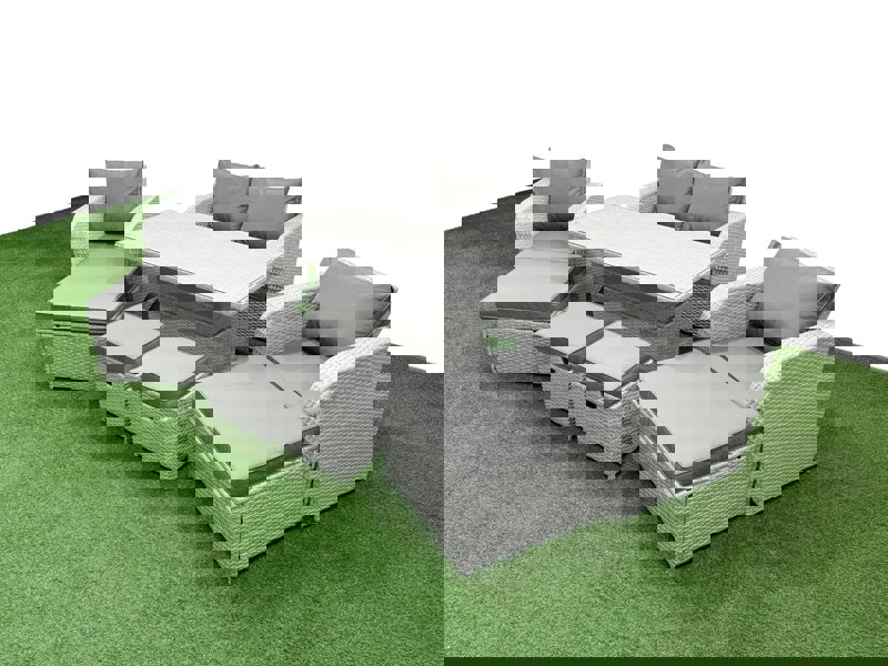 Finished in light grey PE rattan with dark grey fabric, this set is made with a durable galvanised steel construction and a powder-coated finish to help prevent rust. Flat PE rattan is entirely handwoven, while the table is topped with 5 mm thick transparent tempered glass with suction pads to help prevent sliding.