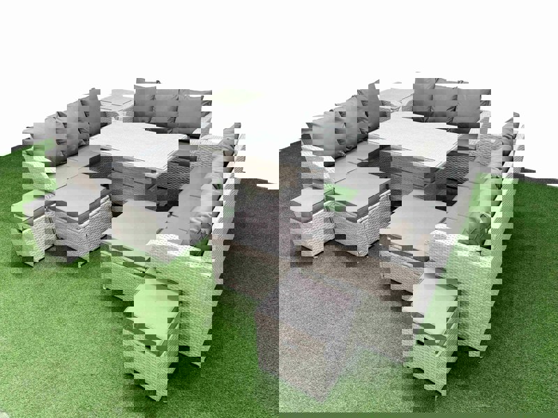 Finished in light grey PE rattan with dark grey fabric, this deluxe 13 seater set pairs a galvanised steel tube frame with a powder-coated finish to help prevent rust. A height-adjustable lifting table and supportive cushions complete the setup for relaxed outdoor entertaining.