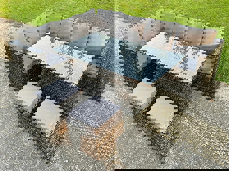 Finished in dark grey mixed PE rattan, the set pairs a durable steel construction with practical details for everyday use, including removable cushion covers and a tempered glass tabletop secured with suckers to help prevent sliding.