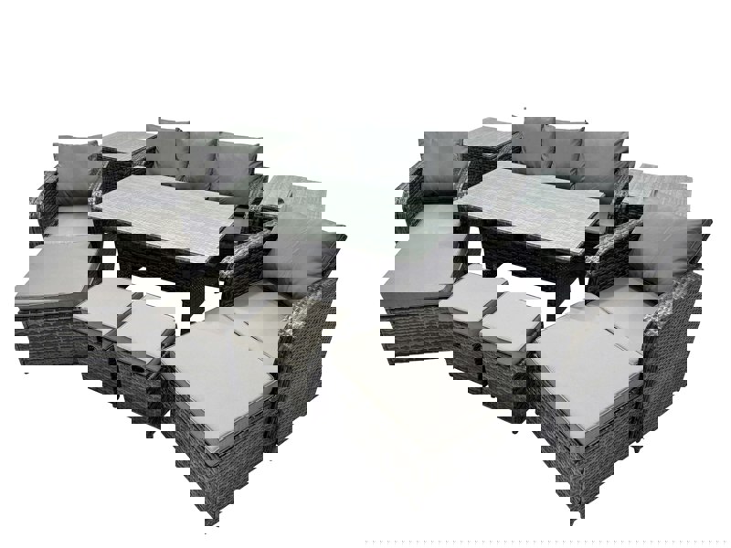Designed for relaxed entertaining, this 8 seat outdoor wicker PE rattan garden furniture set brings coordinated seating and dining to your patio, balcony or indoor spaces. Its dark grey mixed rattan and matching dark grey fabric create a clean, modern look with a subtle country-chic influence.