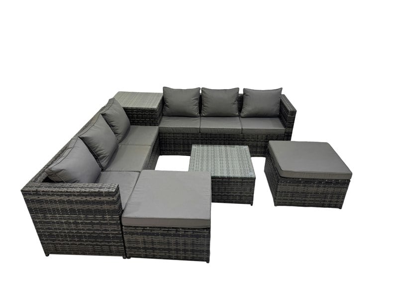 Designed for relaxed outdoor living, this classic corner sofa set seats up to 8 people and pairs a comfortable, soft cushion back with a practical layout for entertaining. Finished in dark grey mixed PE rattan, it is made to suit everyday use on the patio or in the garden.