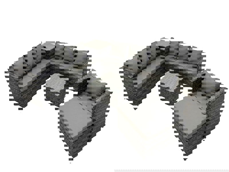 Create a refined outdoor seating area with this classic corner sofa set, designed to accommodate 9 peoples. Finished in premium dark grey mixed PE rattan, it is made to withstand British weather and comes with comfortable seat cushions and soft pillow back cushions for relaxed everyday lounging.