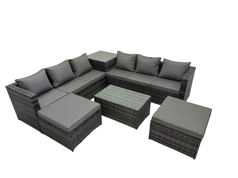 Designed for relaxed outdoor living, this classic corner sofa set seats up to 8 people, creating an inviting space for entertaining and everyday lounging. Soft back cushions and an 8cm-thick seat cushion add comfort, while the dark grey mixed PE rattan is made to withstand British weather.