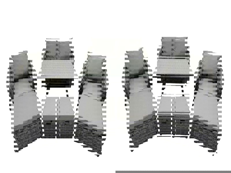 Finished in dark grey mixed rattan with dark grey fabric, the set includes adjustable reclining chairs and supportive cushioning for relaxed seating. A tempered glass tabletop completes the dining table, creating a practical surface for drinks and meals.