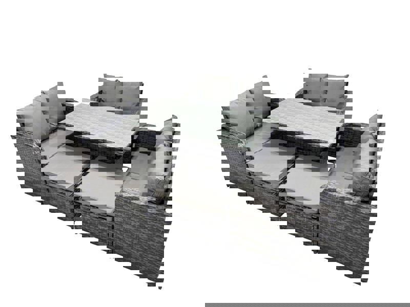 Finished in dark grey mixed rattan with dark grey fabric, the set includes a height-adjustable rising dining table that can be used as a coffee table or dining table. The furniture is flat packed for assembly and designed for low-maintenance outdoor living.