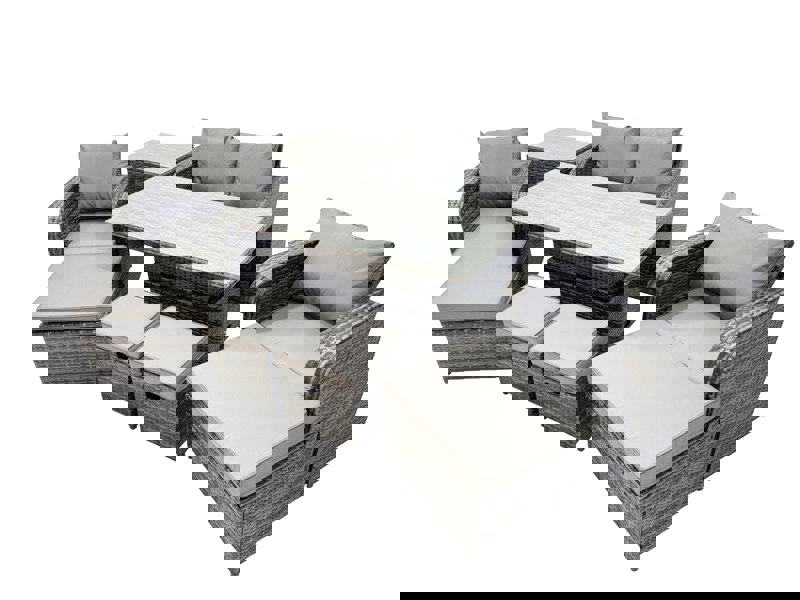 Designed for relaxed outdoor living, this modern deluxe rattan garden furniture set brings together reclining seating and a versatile rising dining table for everyday lounging and casual dining. With cushions shaped to suit the sofa and chairs, it offers a comfortable setup for use in the garden, on the patio or in the conservatory.