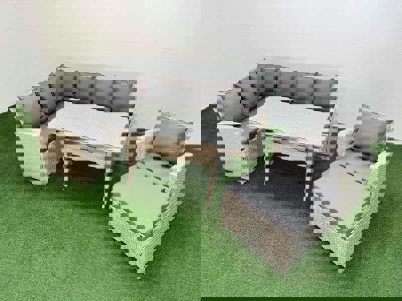 Create a refined outdoor seating and dining area with this deluxe high back rattan corner sofa set. Designed for patios and gardens, it brings everyone together with a coordinated corner arrangement, dining table, chair and footstool for relaxed everyday use and entertaining.