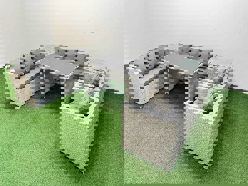 Finished in light grey mixed rattan with dark grey fabric, the set is supplied flat packed for easy assembly. Low-maintenance details, including removable cushion covers and tempered glass table tops, help keep the set looking its best through the season.