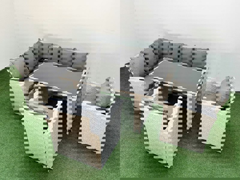 Designed for outdoor lounging and dining, this classic corner sofa set seats up to 8 people and pairs a comfortable, soft back cushion with a coordinated dining table and 2 chairs. Finished in light grey mixed rattan with dark grey fabric, it offers a refined look for patios, conservatories and garden spaces.