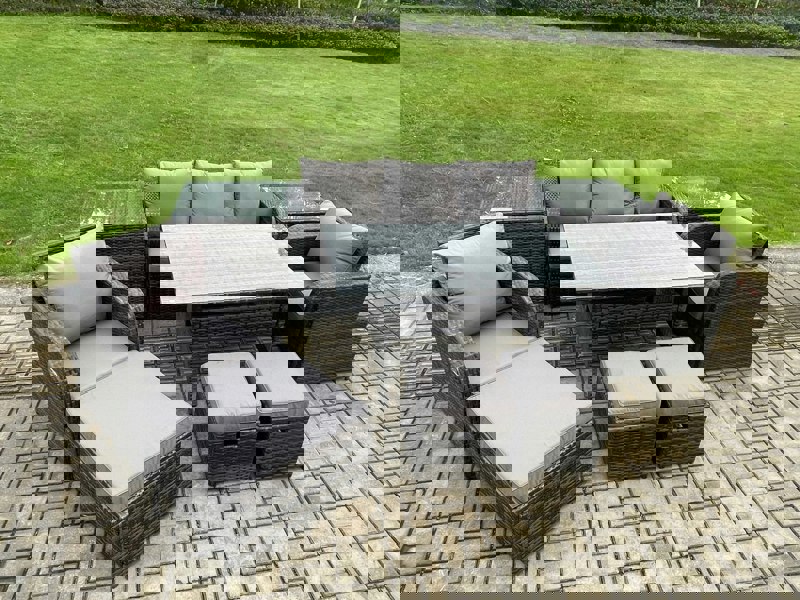 This 9-piece rattan outdoor furniture set is designed for relaxed patio or garden living, bringing together a rectangular dining table, sofa seating, side tables and footstools for easy entertaining. The two armchairs recline, letting you adjust the backrest angle from 90° to 130° via an easy-button mechanism.