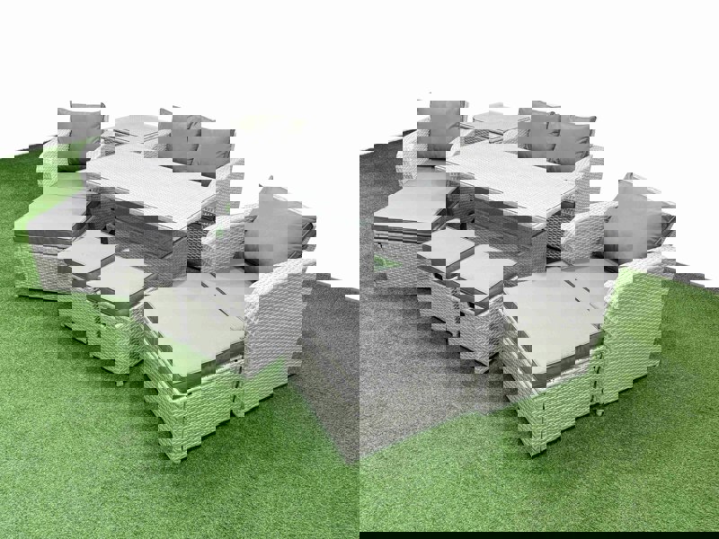 Crafted from light grey PE rattan with dark grey fabric, the set combines a handwoven finish with galvanised steel tube frames and a powder-coated finish to help prevent rust. A lifting table with a height-adjustable design completes the setup for flexible dining and drinks.