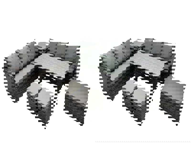 Create a refined seating and dining area with this outdoor rattan furniture set, designed for use both indoors and outdoors. With PE rattan and a galvanised steel construction, it offers a sturdy, long-lasting setup for patios, balconies and relaxed entertaining at home. The look blends country chic with modern minimalism, finished in dark grey mixed rattan with dark grey fabric.