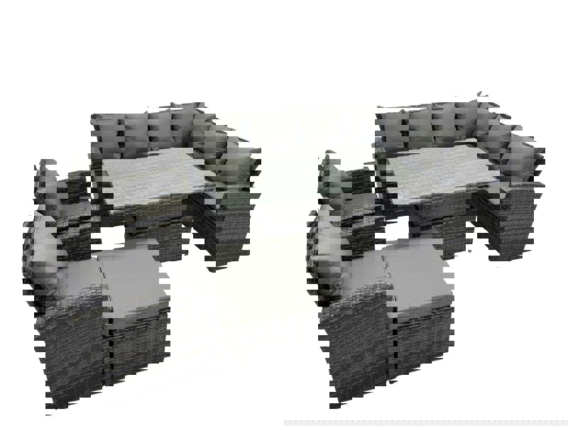 This classic high-back sofa set is designed to accommodate 9 people, creating a comfortable space for outdoor lounging and relaxed dining. Finished in premium dark grey mixed PE rattan with matching dark grey fabric, it brings a coordinated look to patios, terraces and garden seating areas.