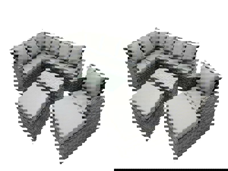 Designed for flexible living, this corner sofa set can be used indoors or outdoors, making it an elegant choice for patios, balconies and relaxed entertaining at home. The dark grey mixed rattan is paired with dark grey fabric for a cohesive, contemporary look.