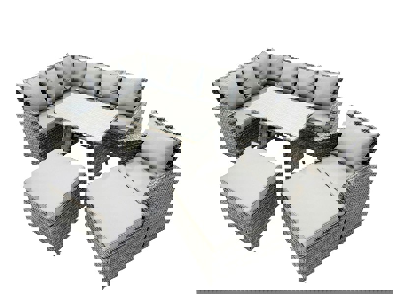 Made with PE rattan and a galvanised steel construction, the set is built for sturdiness and long-lasting use. Comfort is enhanced with an ergonomic high-back, a reclining design, and supportive cushions, while the rectangular dining table is finished with tempered glass secured with suckers to help prevent sliding.