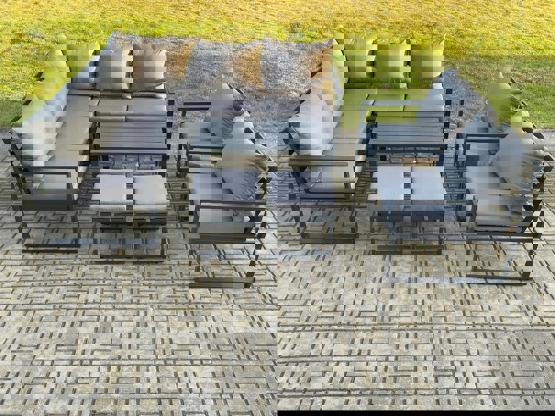 Finished in dark grey powder coating with matching dark grey fabric, the set includes a coordinating oblong coffee table and two footstools, offering a practical layout for everyday lounging. Seat cushions are 9 cm thick, paired with soft pillow back cushions for added comfort.
