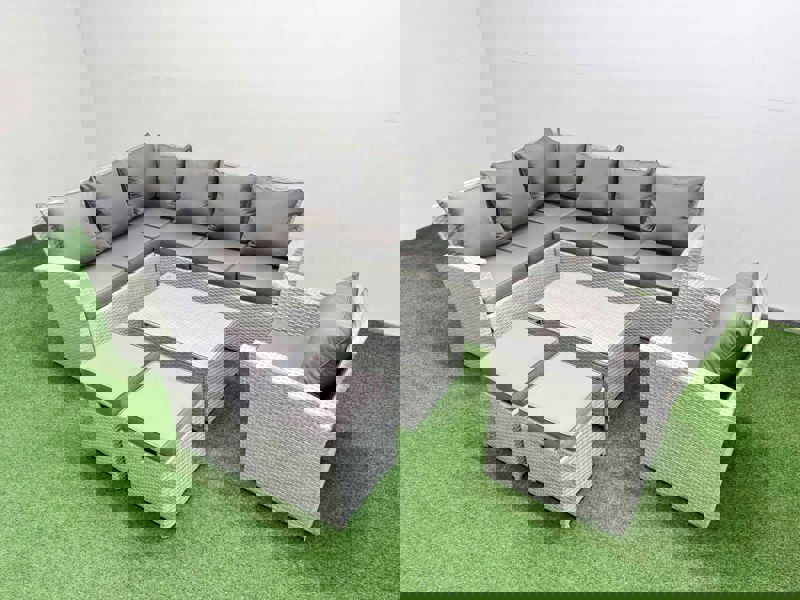 Finished in light grey mixed rattan with dark grey fabric, it includes a coffee table with tempered glass and supportive seating with thick cushions, making it a considered choice for everyday use on the patio or in the garden.