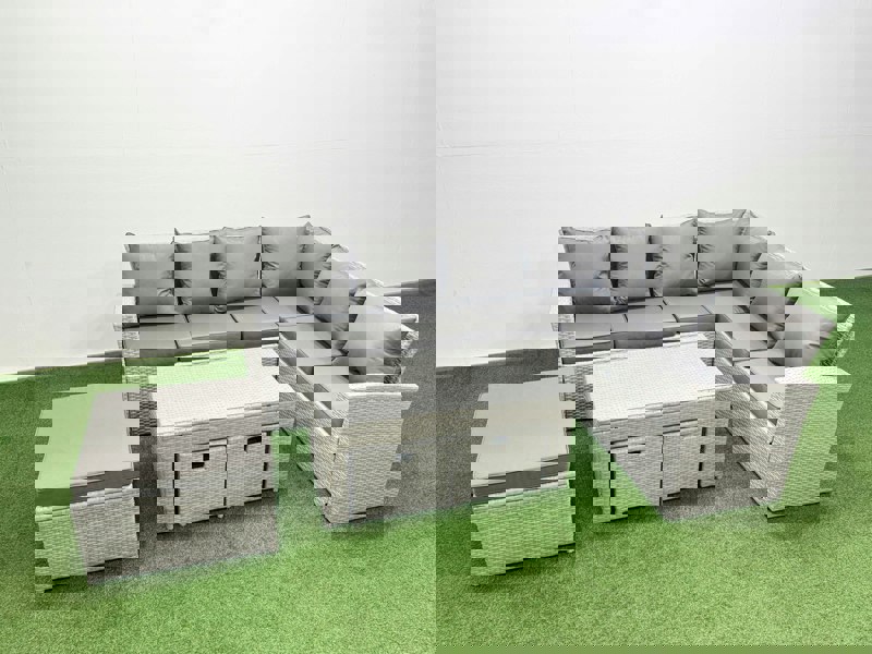 Designed for flexible living, this patio corner sofa set can be used both indoors and outdoors, making it a versatile choice for a garden, patio or balcony. With PE rattan and a galvanised steel construction, it is built for sturdiness and long-lasting everyday use, while the light grey mixed rattan and dark grey fabric bring a clean, contemporary finish.