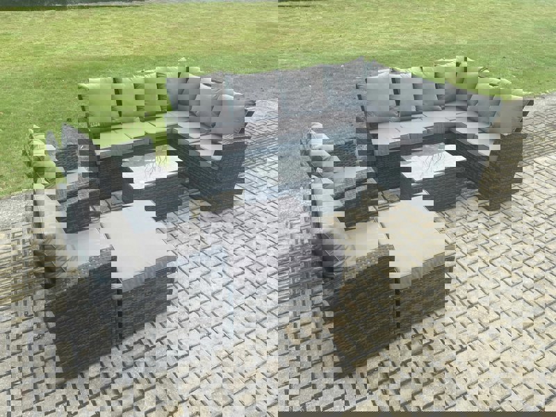 Create a refined outdoor seating area with the Fimous 9 Seater High Back Rattan Corner Sofa Set. Designed for patios and gardens, this coordinated set brings generous space for relaxing with family and friends, with a high-back profile and supportive cushions for everyday comfort.