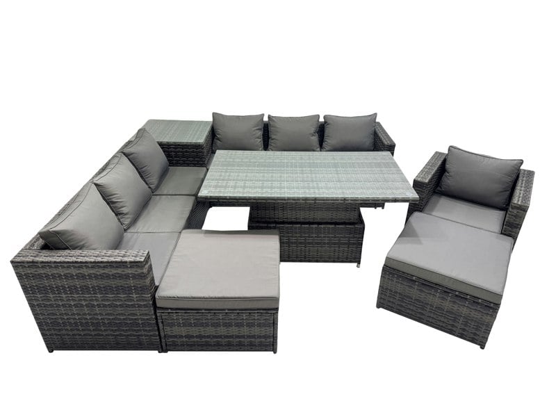 Finished in dark grey mixed rattan with dark grey fabric, the set includes a rising dining table that can be used as a coffee or dining table. A tempered glass tabletop is included for a sleek, functional surface.
