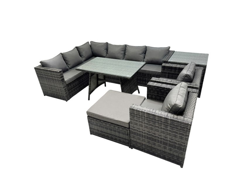 Supplied flat packed for easy assembly, the set includes seating, tables and cushions to support relaxed everyday lounging as well as outdoor dining. The dark grey mixed rattan finish is paired with a tempered glass tabletop, secured with suckers to help prevent sliding during use.
