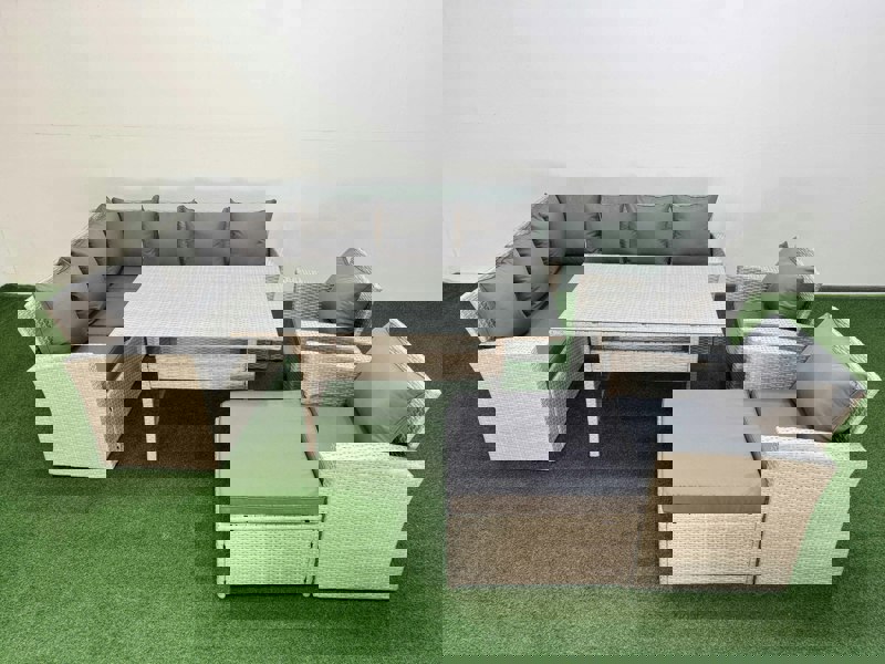This deluxe high back rattan corner sofa set is designed for relaxed outdoor dining and lounging on the patio or in the garden. Made with PE rattan and a galvanised steel construction, it offers a sturdy, durable setup for everyday use with family and friends.
