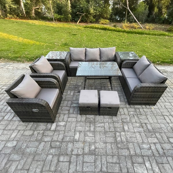 Fimous 9 Seater Rattan Garden Furniture Set with 2 Sofas, Dining Table, 2 Small Footstools, 2 Side Tables - Dark Grey