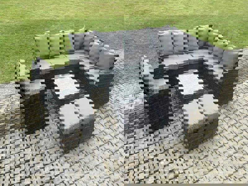 This 9 seater outdoor corner sofa set is designed to bring comfortable, sociable seating to your patio or garden. Made from PE rattan with a galvanised steel construction, it offers a sturdy setup for outdoor living and can be left outside all year round.
