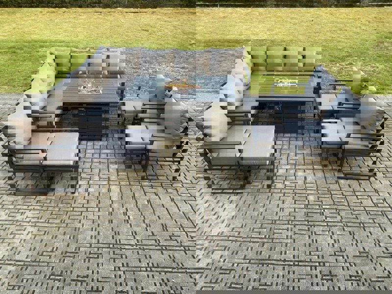 Designed for outdoor dining and relaxed evenings, this aluminium gas fire pit sofa dining set seats up to 12 people with a generous mix of sofas, chairs and stools. Soft back cushions and thick seat cushions help keep guests comfortable, whether you are hosting or unwinding at home.
