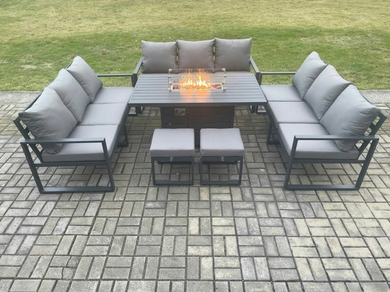 Create a refined outdoor setting for relaxed dining and evening gatherings with this 11 seater aluminium gas fire pit sofa dining set. Designed for patio living, it pairs a sofa layout with a dining table featuring an integrated fire pit, offering a comfortable place to sit, serve and socialise outdoors.