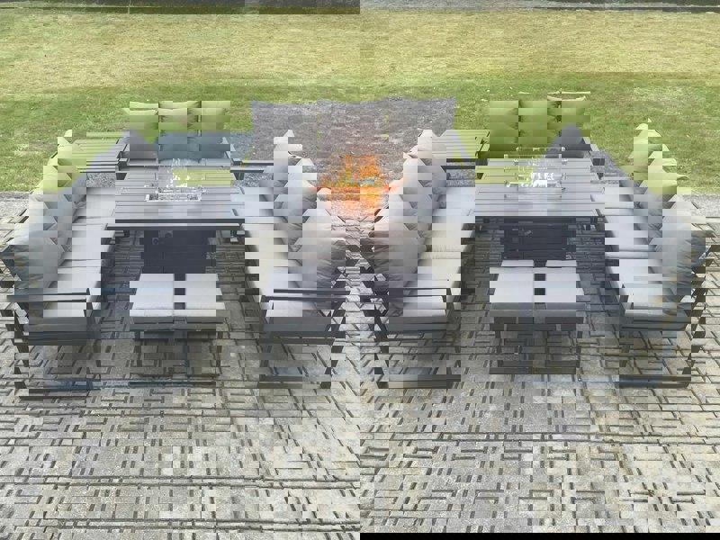 Designed for outdoor dining and relaxed evenings, this 11 seater aluminium garden furniture set combines a sofa arrangement with a gas fire pit dining table, plus coordinating stools and a side coffee table. Finished in dark grey powder coating with dark grey fabric, it creates a cohesive look for patios and garden spaces.