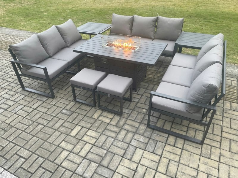 Designed for relaxed outdoor dining and evening gatherings, this 11 seater garden furniture set pairs a sofa dining layout with a gas fire pit dining table. Soft back cushions and thick seat cushions create a comfortable place to sit, whether you are hosting friends or enjoying everyday time outside.
