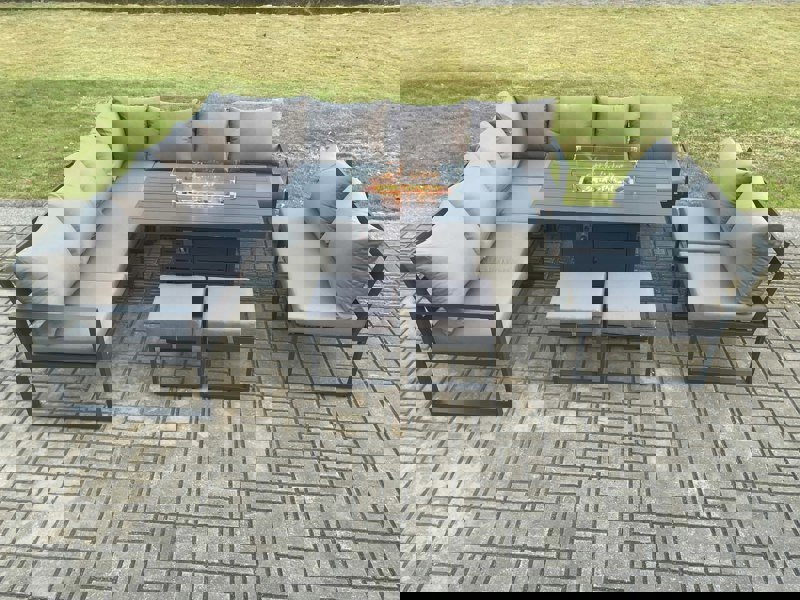 This aluminium gas fire pit sofa dining set is designed for relaxed outdoor dining and lounging on your patio or in the garden. Finished in dark grey powder coating with matching dark grey fabric, it brings a coordinated look to your seating area while keeping everything together in one set.