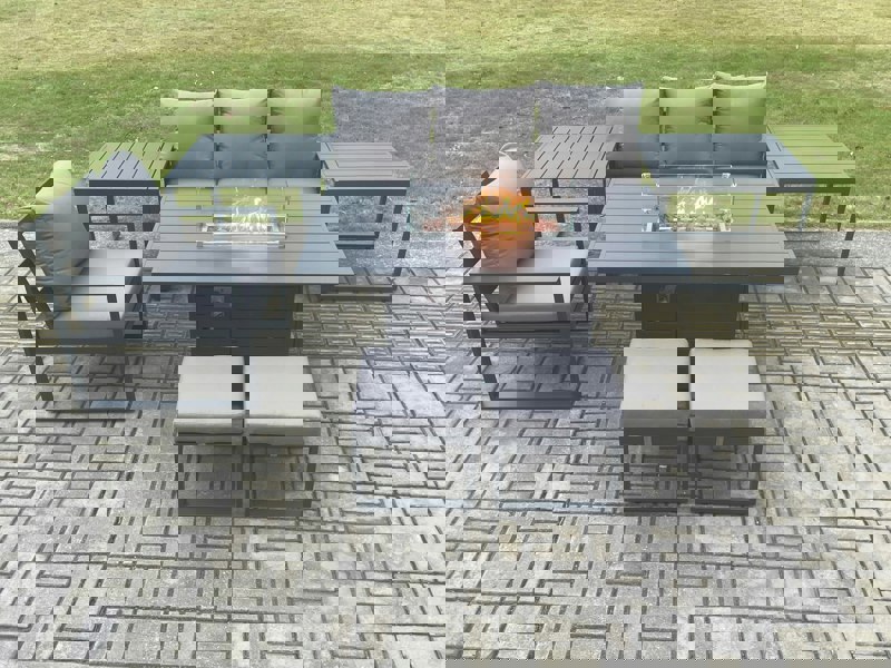 Bring relaxed dining and fireside lounging together with this 7-piece aluminium garden furniture sofa set, designed for both indoor and outdoor use. With a gas fire pit dining table at its centre, it creates a practical space for entertaining on a patio or balcony, while the dark grey finish and cushions add a clean, contemporary look.