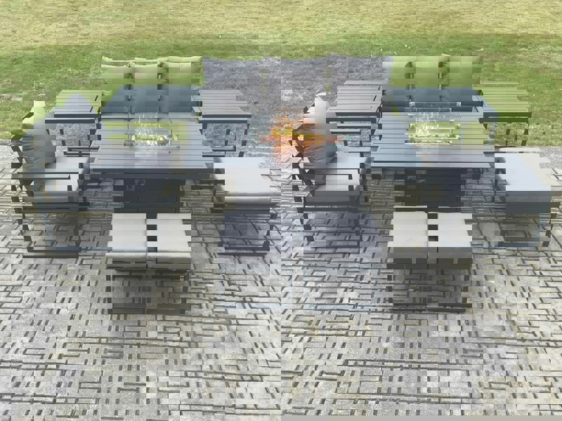 Designed for flexible entertaining, this aluminium gas fire pit sofa dining set can be used indoors or outdoors, making it a refined choice for everything from relaxed evenings to sociable meals. With a dark grey powder-coated finish and matching dark grey fabric, it brings a clean, modern look with a subtle country-chic influence.