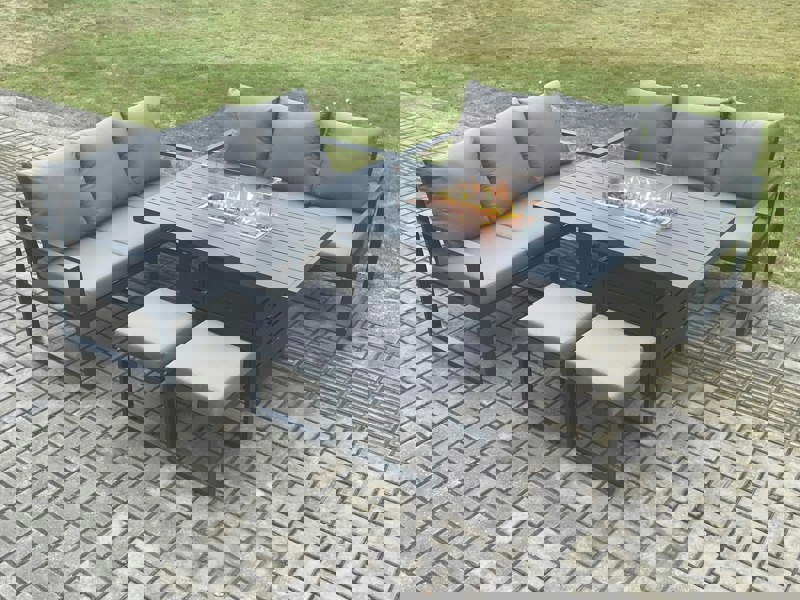 Create a refined outdoor setting with this aluminium lounge and dining set, designed for relaxed evenings and sociable meals in the garden or on the patio. Finished in dark grey powder coating with matching dark grey fabric, it pairs a sofa arrangement with a dining table featuring a built-in gas fire pit for added ambience.