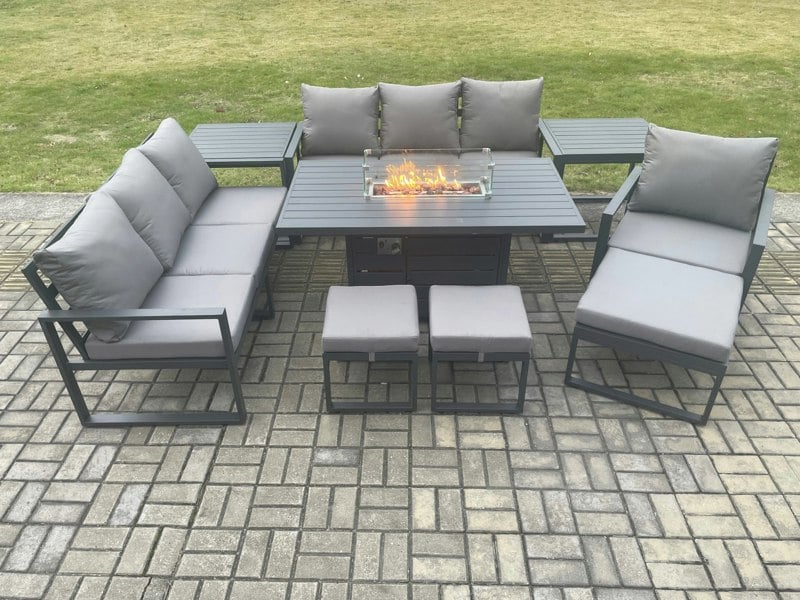 Designed for relaxed outdoor living, this 9-piece garden furniture set brings together generous seating and a dining table with an integrated gas fire pit for sociable patio moments. Made with an alloy aluminium construction, it is built for sturdiness and long-lasting use, and can be kept outdoors all year round.