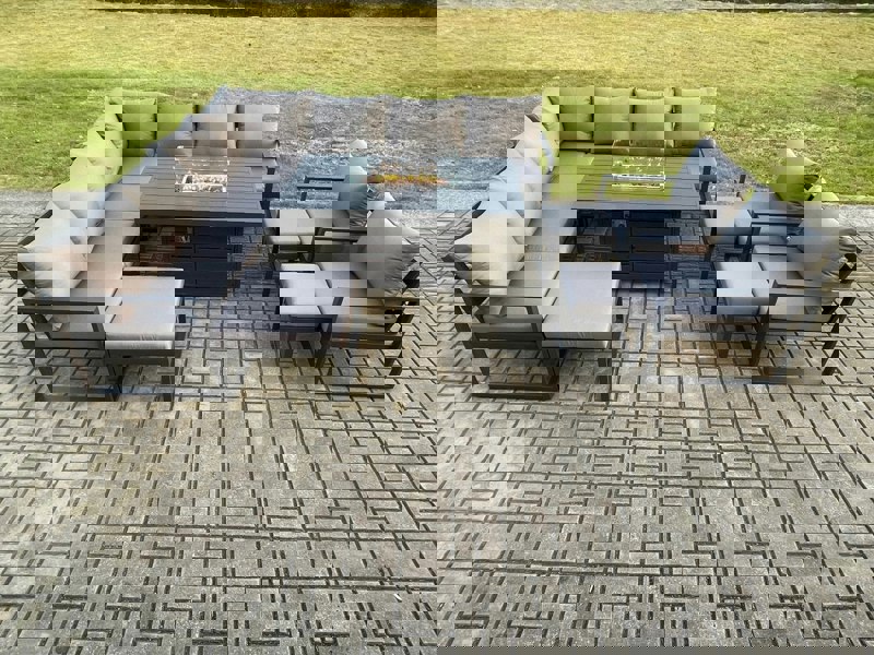 Create a refined outdoor dining and lounging area with this aluminium garden furniture gas fire pit dining table set. Designed to seat up to 12 people, it offers generous space for relaxed gatherings, with a dining table that holds food, drinks and more across patios, gardens, backyards and poolside settings.