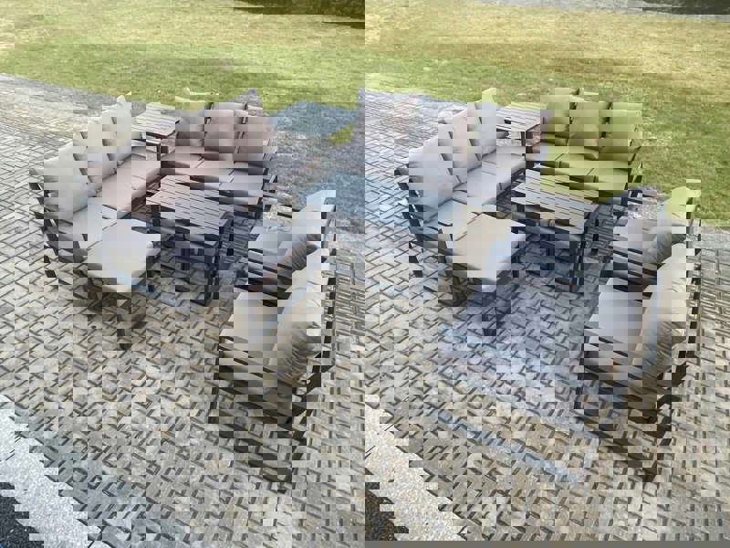 Create a refined outdoor seating area with this 11 seater deluxe aluminium sofa set, designed for patios and gardens. Made from alloy aluminium with a powder-coated finish, it is built for sturdiness and structural durability, while the dark grey fabric cushions bring comfort for everyday lounging and entertaining.