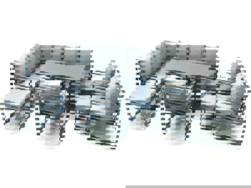 This aluminium outdoor garden furniture set is designed for relaxed patio and garden living, combining sofa-style seating with an adjustable rising dining table for flexible everyday use. Finished in dark grey powder coating with matching dark grey fabric, it offers a coordinated look for entertaining, dining, or unwinding outdoors.