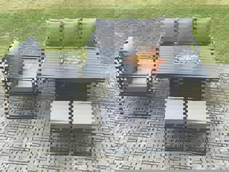 Create a refined outdoor dining and lounging area with this aluminium garden furniture set, designed to seat up to 6 people. Centred around a dining table with integrated gas fire pit, it offers a practical surface for food, drinks and entertaining, making it well suited to patios, gardens, backyards and poolside spaces, as well as indoor settings.