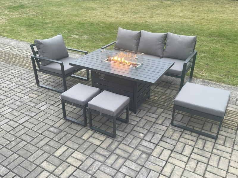 Create a refined outdoor dining and lounging area with this aluminium garden furniture set, complete with a gas fire pit dining table. Designed to seat up to 7 people, it offers generous space for relaxed meals, drinks and entertaining across patios, gardens, backyards and poolside settings, as well as indoor spaces.