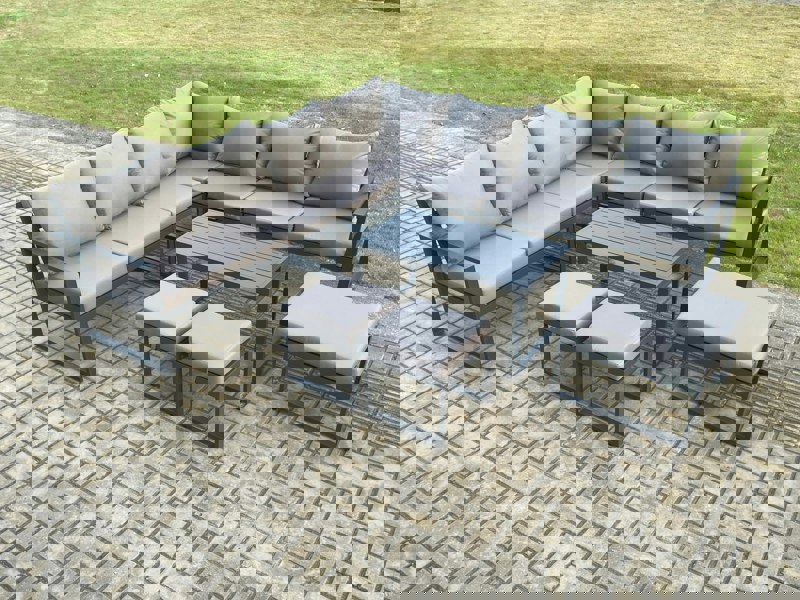 Create a refined outdoor seating area with this aluminium garden furniture sofa set, designed to offer generous space for up to 10 people. Complete with an oblong coffee table for food and drinks, it’s a practical choice for patios, gardens, backyards, poolside settings, and other indoor or outdoor spaces.