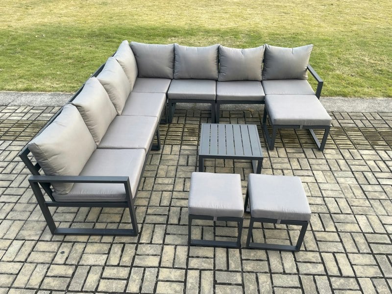 Designed for relaxed entertaining, this aluminium outdoor garden furniture sofa set offers generous seating for up to 10 people, with a square coffee table to keep food, drinks and essentials close at hand. A versatile choice for patios, gardens, backyards and pool areas, it also suits a range of indoor and outdoor spaces.